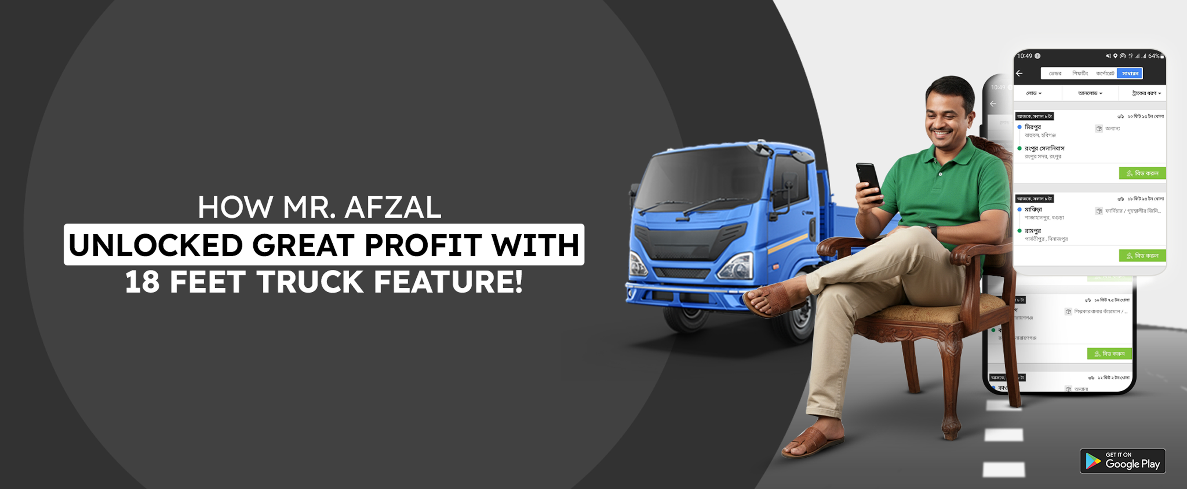 Truck Lagbe is the country’s leading digital logistics platform. It is committed to making trip management faster, easier, and more affordable for its users. In line with that goal, Truck Lagbe has introduced two exciting new features in the Truck Lagbe Owner App - 0% Commission and Direct Call Option. This feature is available for all types of trips, from 18 feet trucks to trailer trucks. With these new features, Mr. Afzal is now enjoying greater profits and a smoother service experience.